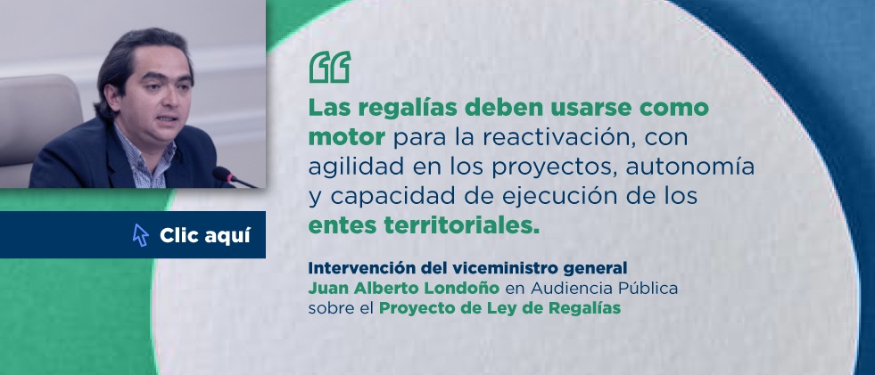 "Las regalías deben usarse como motor para la reactivación, con agilidad en los proyectos, autonomía y capacidad de ejecución de los entes territoriales". Intervención del viceministro general Juan Alberto Londoño en Audiencia Pública